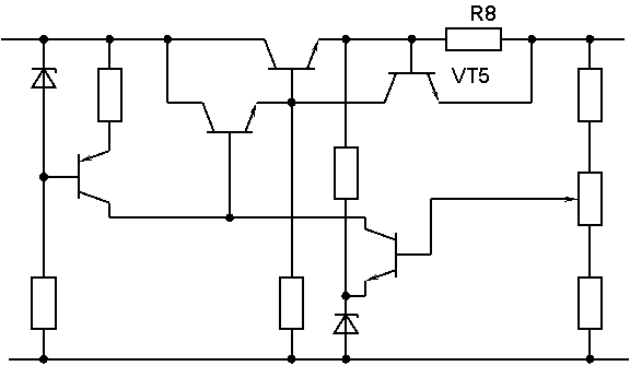 Схема защиты компенсационного стабилизатора от перегрузки реализована на элементах VT5 и R8.