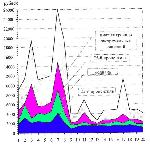 Граница, отделяющая нижнюю заштрихованную область - 25-й процентиль. Заработная плата четверти самых низкооплачиваемых работающих не превышает эту величину (в среднем по предприятиям - 1,9 тыс. рублей). Выше расположена медиана (в среднем - 3,1 тыс. рублей). Половина работников получает зарплату в пределах этой суммы. Три четверти работающих имеет зарплату, не превышающую величину 75-ro процентиля (в среднем по предприятиям он равен 5,9 тыс. рублей). В пределах верхней границы (в среднем по предприятиям- 12,2 тыс. рублей) получает заработную плату большинство работающих, за ней начинаются экстремальные значения, не отображенные на данной диаграмме. Экстремально высокие значения зарплаты начисляются 5% работников. Наибольшие из экстремальных значений приводятся в таблице 13: