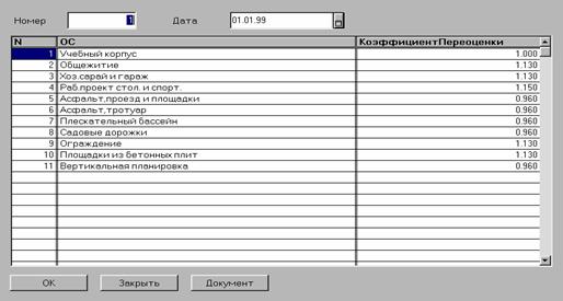 Для каждого основного средства, подлежащего переоценке, предварительно должен быть задан коэффициент переоценки - коэффициент пересчета балансовой стоимости основного средства в восстановительную стоимость Для основных средств, не подлежащих переоценке, не нужно указывать коэффициент переоценки. Такие основные средства не будут участвовать в расчете.