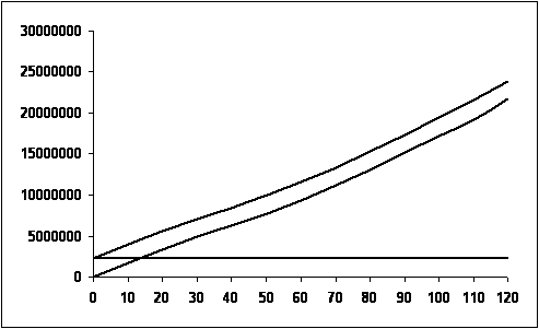 Следует отметить, что средние постоянные издержки сначала падают, достигая своего минимального значения 50022,95 при объеме производства 20 млн. флаконов, а затем начинают расти, достигая максимального значения 181211,2 при объеме производства 120 млн. флаконов.
