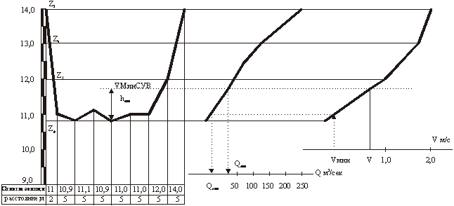 Минимальный сплавной расход определяется по поперечному профилю лимитирующего створа и кривым расхода воды и скоростей, построенным для этого створа (рис.6).
