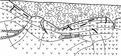 Кальцитовая минерализация в ман- °^$^' и дельштейнах, не связанная с шаровыми У)*'^0)-'^0 г?1 ^ лавами, наблюдается в тектонической зоне, наложенной на лавовые покровы низов нидымской свиты. Пачка, состоящая из 1, 2 и 3 покровов, наклонена на ^.^О^Д СЯ ^ северо-запад под углом от 10 до 60° и >|о (<^^> <'-1 '| пересечена вертикальными сбросами с /'^Т^Ж/^! ^ амплитудой смещения блоков до 10— ^у^—^ г^\ 1 15 м. Минерализация развита в ман- ^'<^.г^^о|э> \°°>\ ••= дельштейнах 2 пбкрова, мощность кото- >Лм?т^' ^^~ ^ рых в этом месте достигает 10 м, и в пе- ^^^"^ ° --I рекрывающем их покрове-сателлите 2а, ^^^^ > РП р сложенном почти нацело мандельштей- •>А^'У,^'\< о |>| ^ ном.