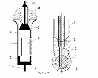 На рис. 2.2 а представлен полупроводниковый терморезистор, чувствительный элемент которого выполнен в виде небольшого цилиндрического стержня 8, покрытого эмалевой краской и металлической фольгой 3, с контактными колпачками 2, 4 и выводами 1, 5. снаружи терморезистор защищен чехлом 7, в верхней части которого имеется стеклянный изолятор 6.