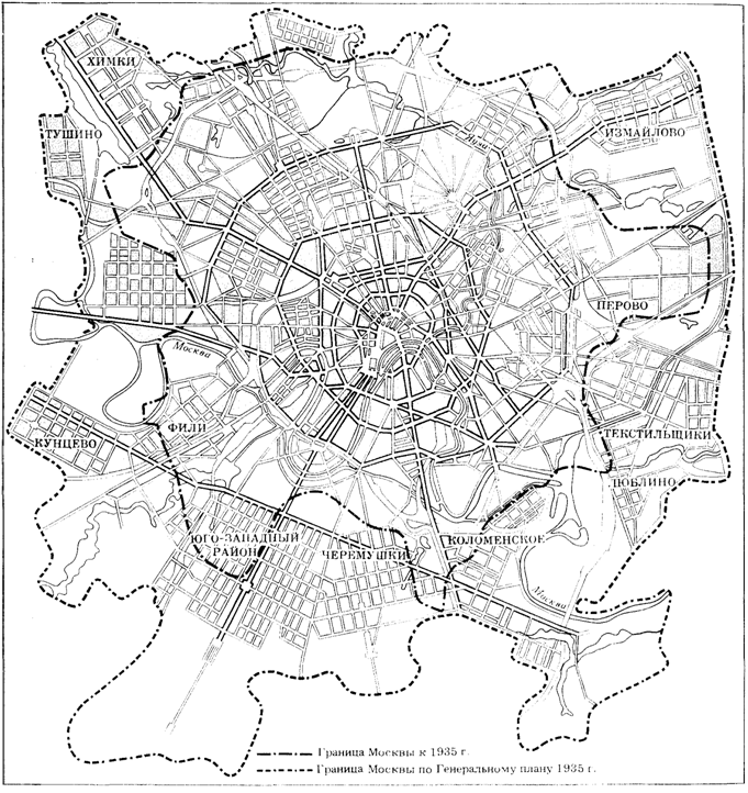 Переустройство Москвы на основе новых принципов градостроительства началось вскоре после победы Великой Октябрьской социалистической революции. Уже в 1918–1925 гг. коллективом архитекторов под руководством А. В. Щусева был составлен план «Новая Москва», в котором отчетливо звучали идеи социалистического преобразования города и были предвосхищены многие принципиальные положения первого Генерального плана реконструкции Москвы. К 1935 г. разработка этого плана (архитекторы В. Н. Семенов, С. Е. Чернышев и др.) была закончена. 10 июля 1935 г. он был утвержден как основной документ, определяющий характер реконструкции всех отраслей городского хозяйства.