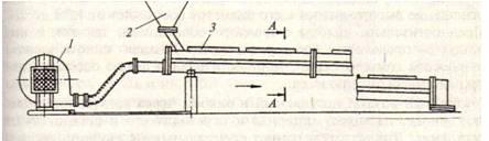 В настоящее время транспортирование порошков в пределах завода осуществляют в основном пневматическим способом при помощи винтовых и камерных насосов. Основные преимущества этого способа – возможность перемещения на большие расстояния, отсутствие пыли, простота и надежность эксплуатации. Аэрационный желоб (рис. 4) разделен по высоте на две части специальной воздухонепроницаемой перегородкой. Нижний лоток служит воздуховодом, куда нагнетается сжатый воздух, а в верхний лоток (транспортный) поступает порошок, насыщенный воздухом. Аэрожелоба просты по конструкции, монтажу и эксплуатации; износоустойчивы; исключают потери от распыления и обеспечивают нормальные условия работы обслуживающего персонала. Но они применимы лишь для дальности транспортирования до 40 м.