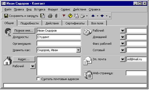 Характеристики «Контакта» заносятся в отдельные поля. По любому полю или его части, например, имени или адресу может выполняться «Сортировка», «Группировка» и «Фильтрация контактов».