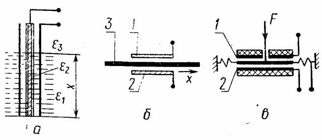 Конструктивные схемы емкостных преобразователей выполняются различных вариантах в зависимости от области применения (Рис. 11) При измерении уровней жидких и сыпучих тел находят применение цилиндрические или плоские конденсаторы (см. Рис. 11,а), емкость которых характеризуется уровнем х и зависит от диэлектрических проницаемостей жидкости