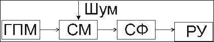 Она состоит из генераторов ГМП, вырабатывающего М-последовательность 111100010011010, 111 ., смесителя СМ, согласованного фильтра СФ и решающего устройства РУ.